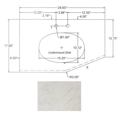 Countertop - Lav Top - 366RDS - 1 1/4" x 17 1/8" x 29" - Pressed - MDF - C2 - WW04 - w/Buildup - Painted White w/Topcoat - P4-0430 - Isla Opal - G1S