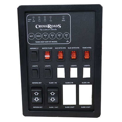2022 Crossroads Cruiser Monitor Panel – 5 Tank – 6 Button (B,F,B,B,G,G) – 7 Switch (W/P,W/H,S/Light,Awning,SO) – 2 Holes – Special Harness